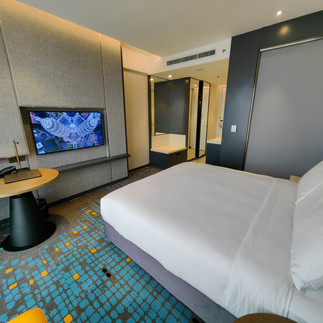 Dengan saiz 322 kaki persegi bilik jenis King Guest ini agak luas. Selain satu katil king terdapat satu kerusi diletakan di sebelah kiri katil dan bentuknya agak pelik (dan saya tidak begitu selesa duduk di kerus ini). Di kaki katil pula terdapat satu meja bulat sederhana besar dan satu kerusi untuk pengunjung melakukan kerja-kerka pejabat ataupun makan di sini. Di atas meja terdapat satu lampu study serta talipon. TV pula dilekatkan di dinding bertentangan dengan katil dan saiznya besar iaitu antara 55 ke 60 inci. Hotel ini adalah salah satu hotel di mana langsirnya menggunakan suiz jika mahu membuka atau menutupnya. Bilik yang saya inap ini mengadap ke i-City.