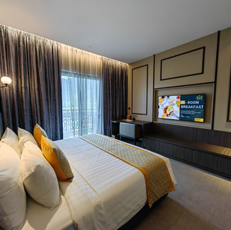 Ruang bilik pula selain satu katil king, terdapat meja kerja di sudut kiri kaki katil. Saiz meja kerja ini agak kecil dan di dinding terdapat satu lampu belajar. Di sepanjang dinding bertentangan kaki katil terdapat rak berlaci untuk meletak barang-barang. Dinding bahagian atasnya pula terdapat TV yang besar bersaiz 55 atau 60 inci. Hotel ini mempunyai balkoni yang bersaiz kecil yang mengadap ke bangunan-bangunan kedai.