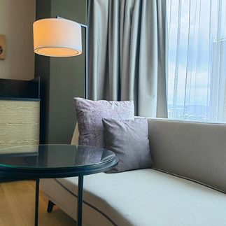Di ruang bilik pula selain satu katil king, terdapat satu sofa yang sederhana besar diletakkan berhampiran tingkap serta satu meja bulat kecil bersebelahannya. Di sebelah kiri katil pula terdapat satu rak kecil menempatkan satu peti ais mini dan air mineral di dalam botol kaca. Selain itu seperti biasa terdapat perkakas untuk membuat kopi, cerek letrik dan juga cawan. Di kaki katil pula terdapat satu kerusi panjang dan TV pula terletak di dinding bertentangan katil. Hotel ini menyediakan TV yang agak besar iaitu dalam 50 inci. Kemudian di bawah TV terdapat satu meja empat segi sama yang sederhana besar dan satu kerusi bagi pengunjung melakukan kerja2 pejabat. Di atas meja itu diletakkan satu lampu study (saya sebenarnya agak musykil kenapa meja ini diletakkan di sini kerana ianya mengganggu penglihatan semasa menonton TV terutamanya jika pengunjung duduk di sofa).
